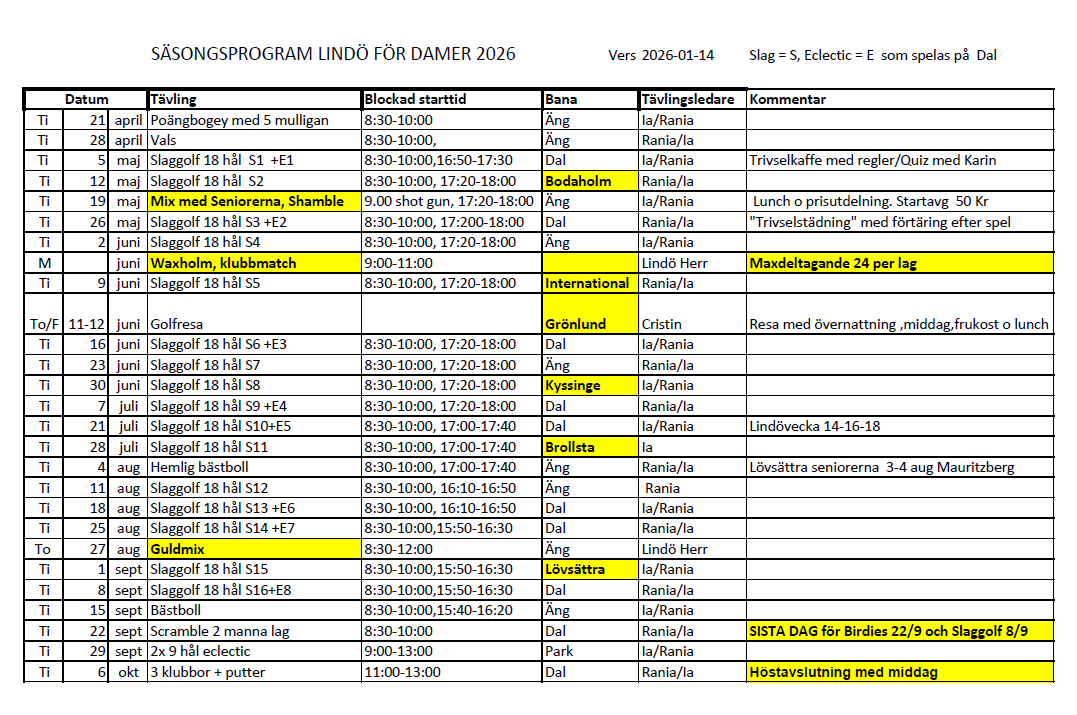 Team Lindö Damer är en del av Huvudstadens Tjejsektion som ett av områdena och riktar sig till kvinnliga medlemmar i Huvudstadens Golfklubb, som är 22 år eller äldre och som vill spela olika former av golftävlingar på tisdagar. Vi spelar mest på Lindö, men även på andra Golfstar-banor norr om Stockholm. Du ser spelprogrammet bifogat för 2026. De flesta tävlingar har en förmiddagsstart (normalt från 08:30) och en kvällsstart (från 16:00-17:30 beroende på årstid). Säsongsavgiften är 350 kronor. Tävlingsavgiften är 40 kr per rond och betalas vid anmälan. Alla anmälningar till tävlingar sker på mingolf.se .
